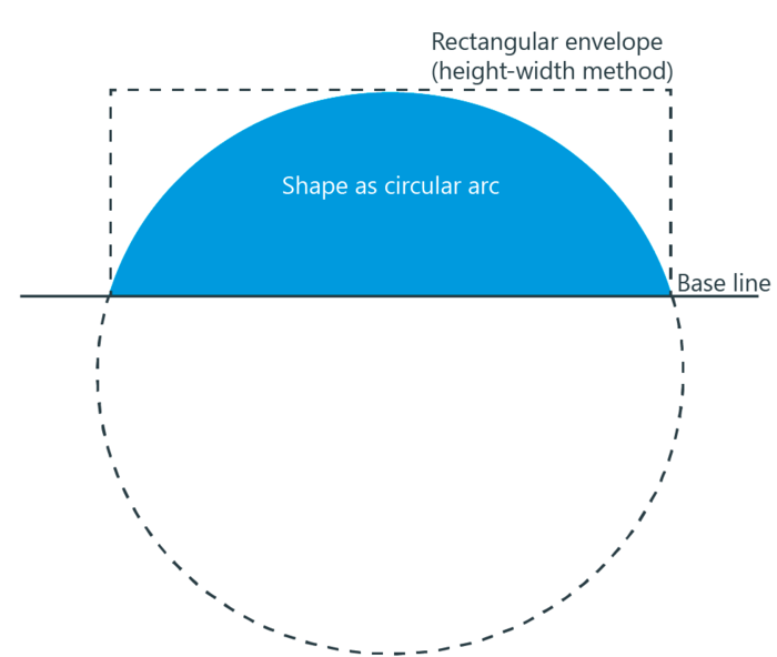 Bei der Höhe-Breite-Methode wird angenommen, dass die Kontur des liegenden Tropfens auf der Oberfläche einen Kreisbogen beschreibt. Aus der Höhe und Breite des den Kreisbogen umschließenden Rechtecks kann der Kontaktwinkel berechnet werden.