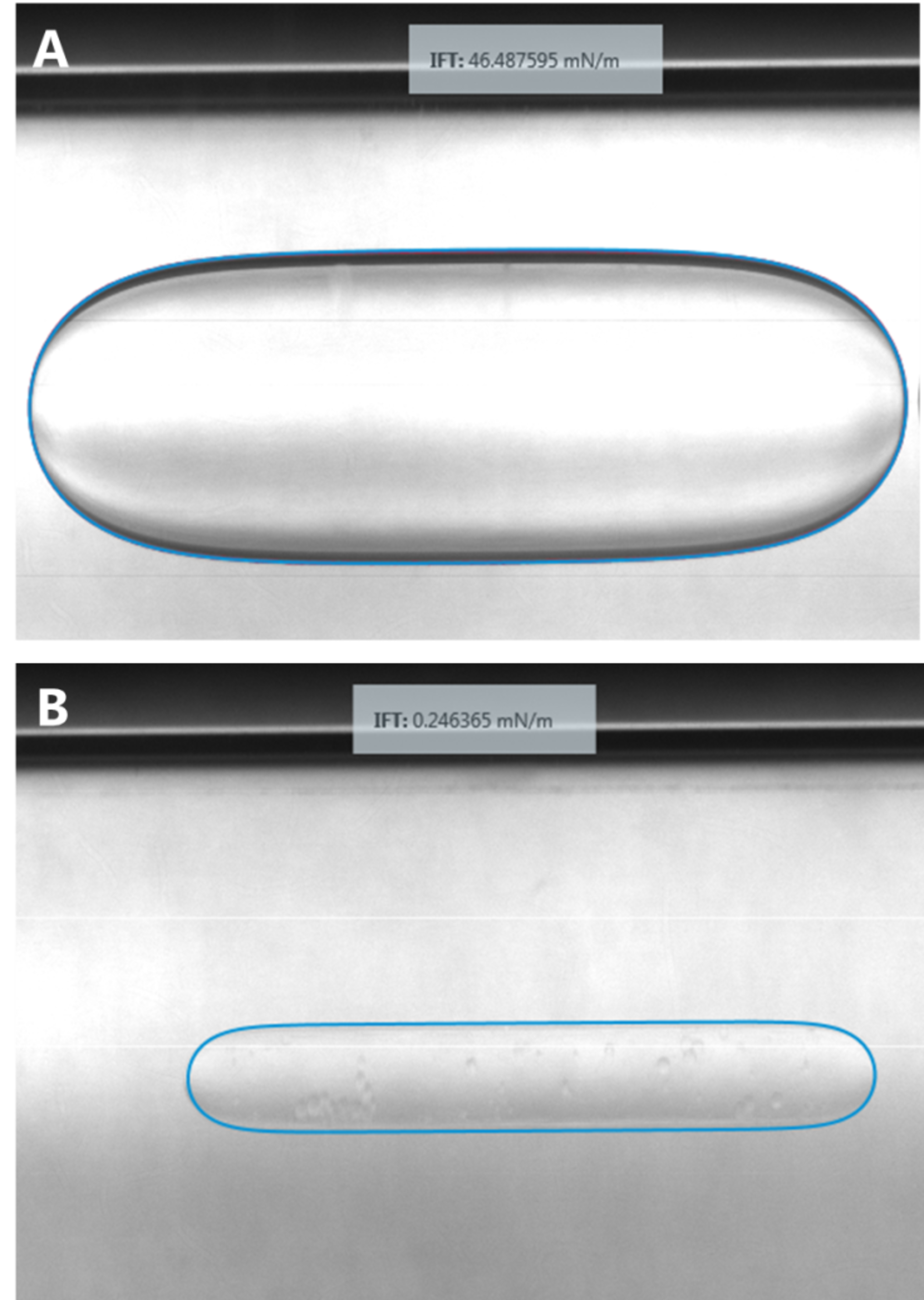 Fig. 1 shows exemplary drop images for the highest IFT (A, sample 1) and the lowest IFT (B, sample 7) of tested samples.