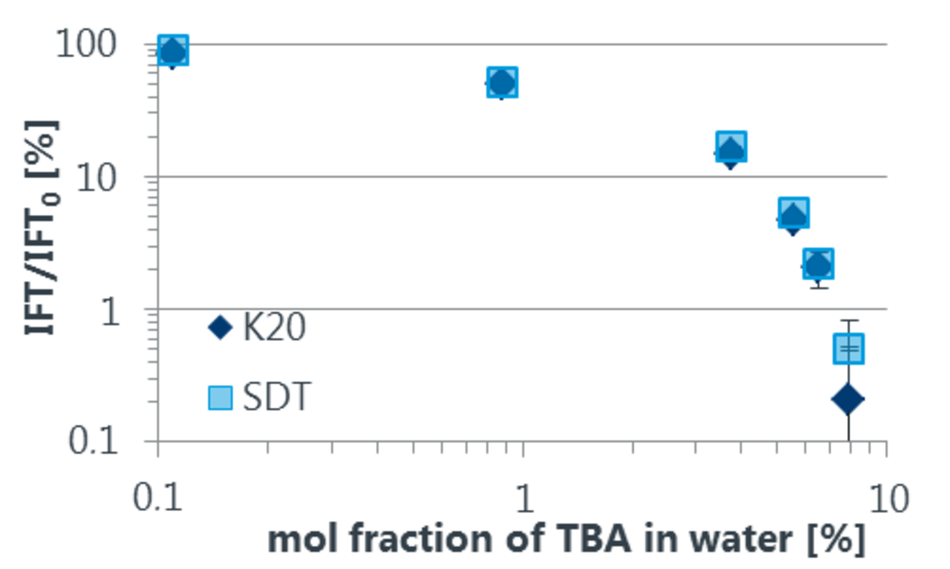 The resulting IFT values for all tested samples, as well as the data from literature that were measured using a K20 force tensiometer [1], are listed in table 2. Additionally, in fig. 2 the normalized IFT is plotted against the mol fraction of TBA in water for SDT and K20 for comparison. The data obtained from both methods are in good agreement, while especially for low IFT values, the standard deviation of SDT measurements is much lower than the one for K20 measurements. Actually, with 0.3 mN/m, the uncertainty for K20 Wilhelmy method is three times the measured IFT, which is why for low IFT values, the spinning drop method is clearly recommended over force-based methods.