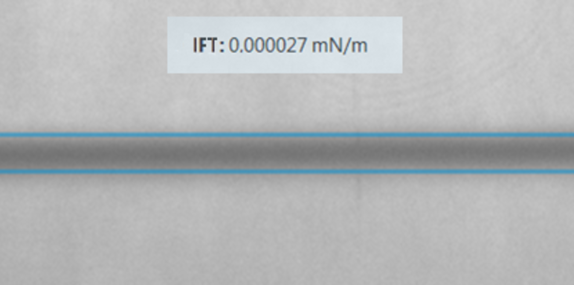 The microemulsion center phase was used for the drop phase and measured against the aqueous bottom phase as the heavy phase with the SDT at 25 °C. An exemplary drop image together with the resulting IFT value of 2.7·10-5 mN/m is shown in fig. 3.
