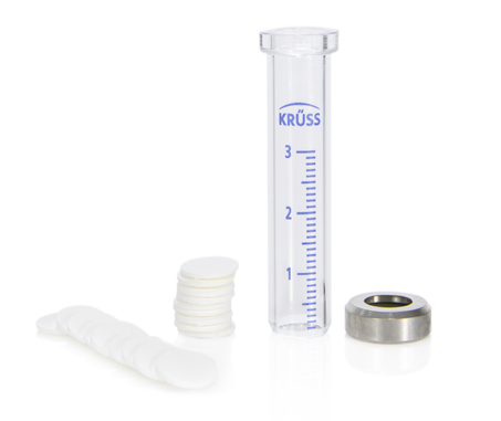 Der Probenhalter SH0810 ermöglicht Messungen des Kontaktwinkels an Pulvern und Pigmenten mit Hilfe der Washburn-Methode. Das Probenröhrchen wird mit Hilfe eines Klemmrings schnell und einfach mit einem Filterpapierboden versehen und mit der Probe befüllt. Im Glasröhrchen können die Höhe und Gleichmäßigkeit der Füllung begutachtet werden. In Sekundenschnelle wird der Probenhalter in den separat zu bestellenden Kraftsensoradapter SH0812 eingehängt.