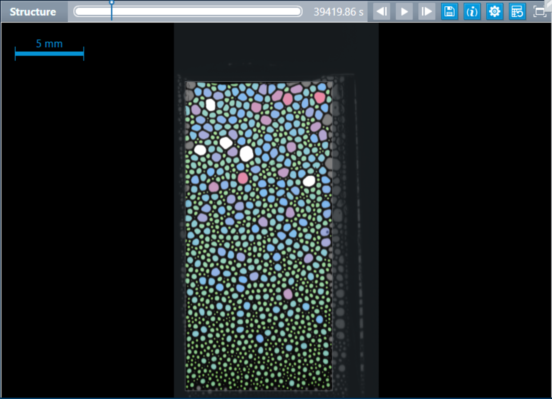 Using the ADVANCE software, the individual images of the foam height and foam structure are continuously recorded and evaluated. The actual bubble sizes are determined in real time and visualized in a histogram for each recorded point in time.
