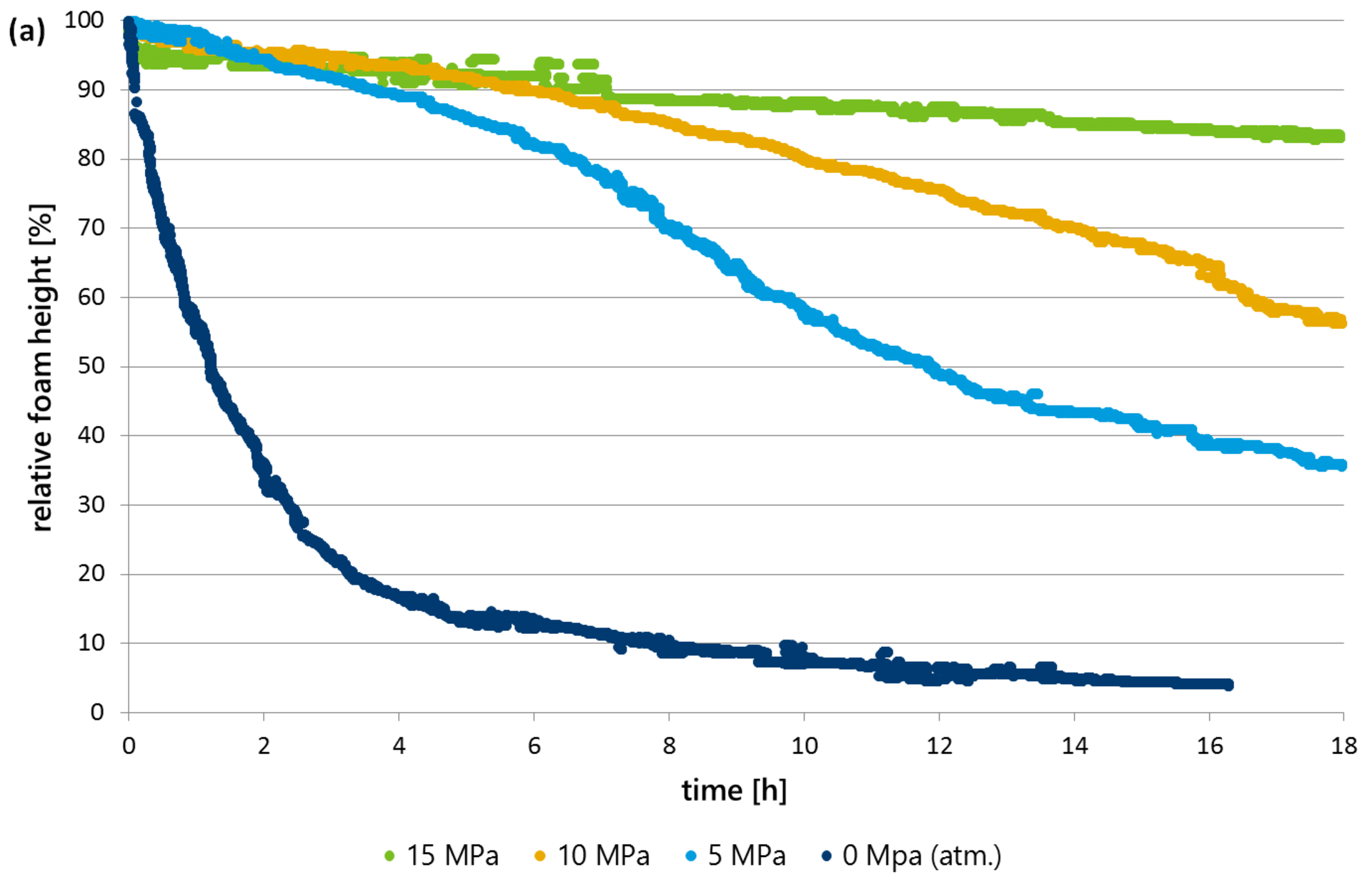 The foam stability and the development of the mean bubble size over the lifetime of a foam depend on various physical parameters, some of which are highly pressure-dependent. These include, in particular, the interfacial tension between the two phases present in the foam, the density and viscosity, which vary over time due to material transfer, and the related mutual solubility.