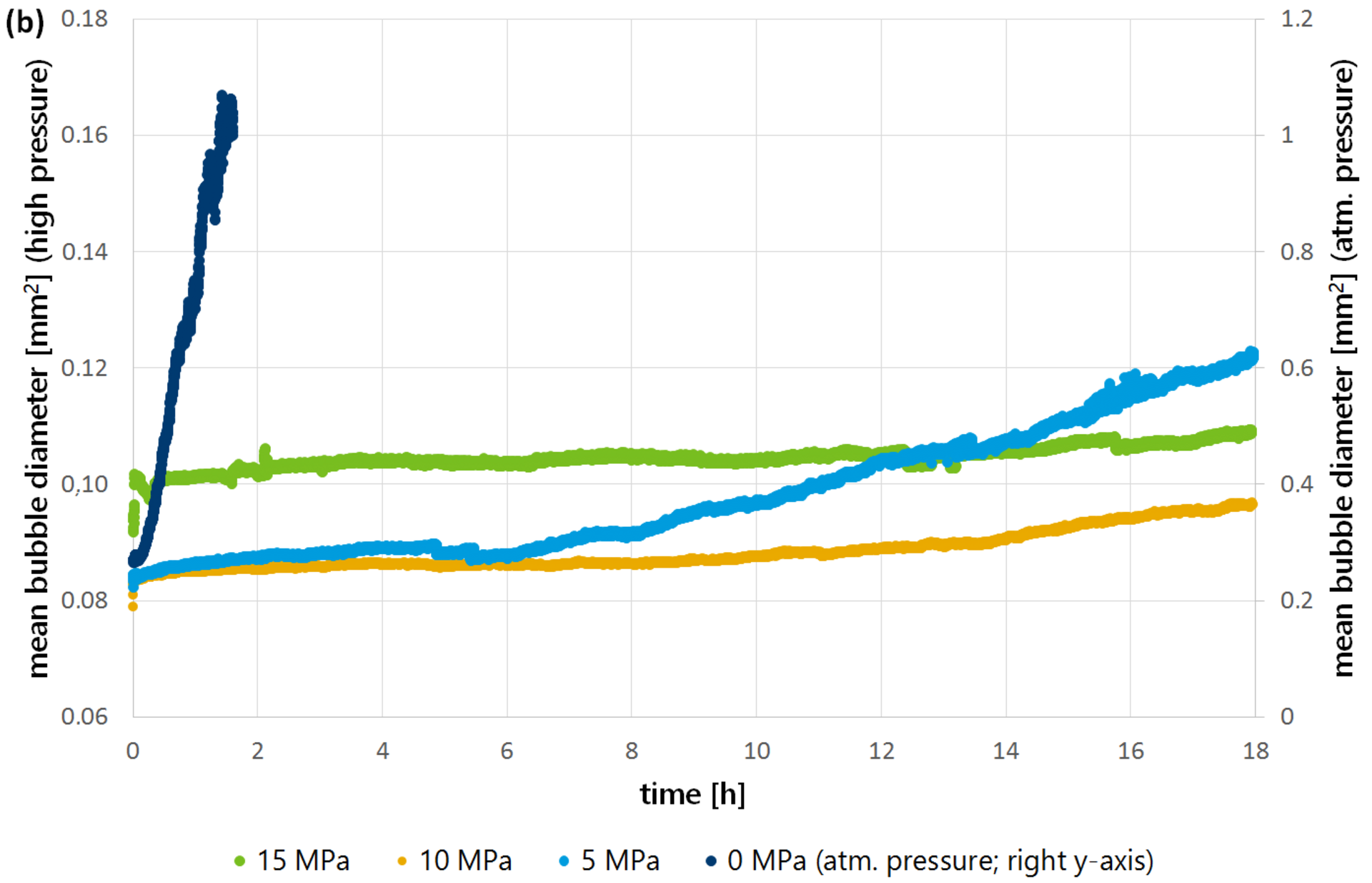 With regard to the mean bubble size, the largest differences can also be found at low pressures. For example, the initial mean bubble size of a foam produced at ambient pressure differs significantly from the initial mean bubble sizes at higher pressures of 5 to 15 MPa. The mean bubble size increases with time at all pressures; this effect decreases with increasing pressures and is hardly noticeable at 15 MPa. Here the bubble size is very constant, which also indicates a high stability of the foam.