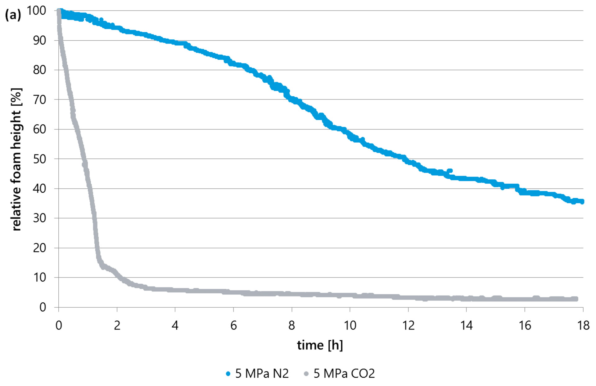 Furthermore, the influence of the gas type for the most important gases nitrogen (N2) and carbon dioxide (CO2) on the foam behavior was investigated.