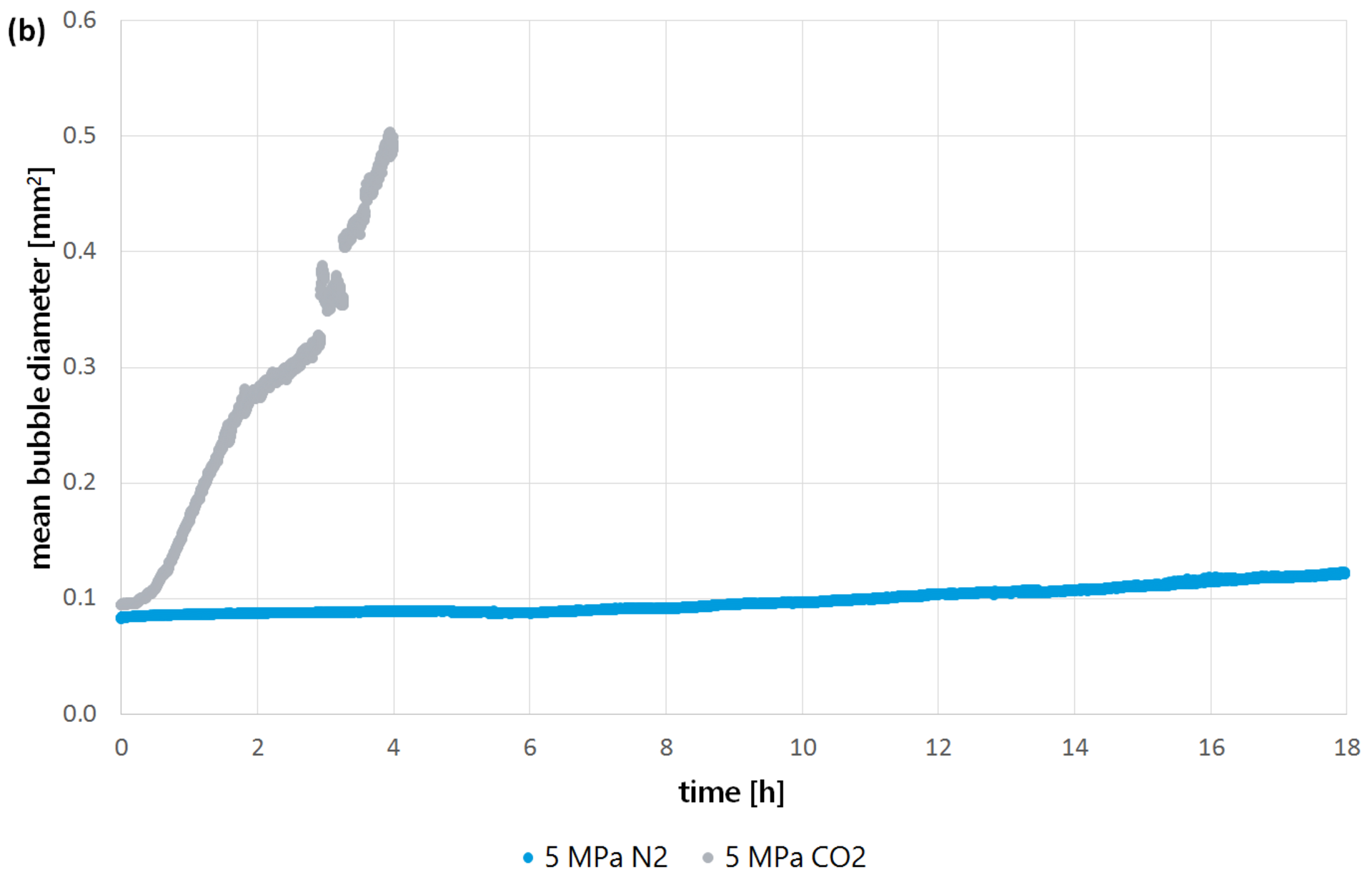 The initial mean bubble size is comparable and therefore only pressure-specific and not gas-specific. The mean bubble size of CO2 foam increases significantly faster over time than that of N2 foamed samples (see Fig. 5 b).