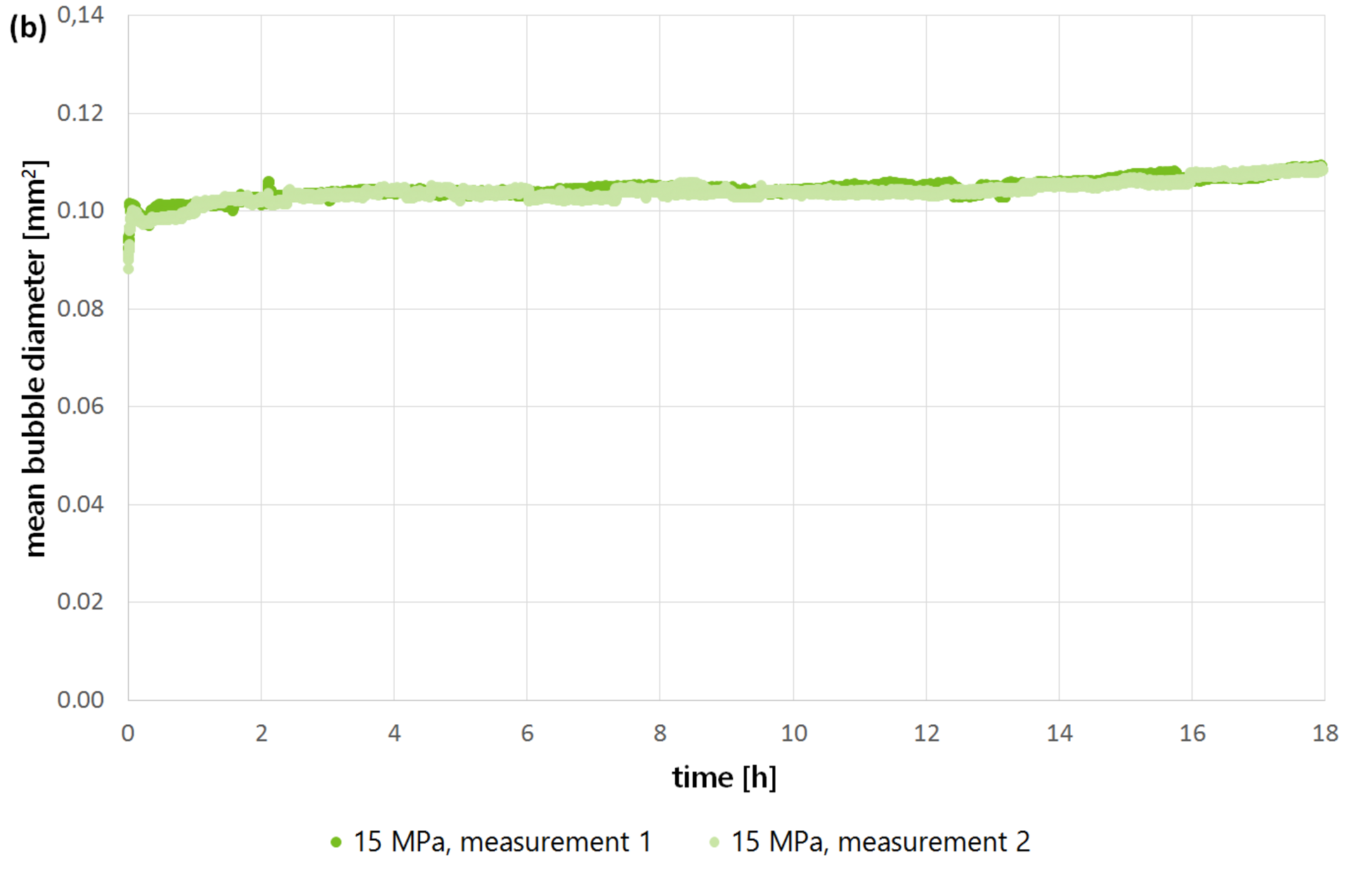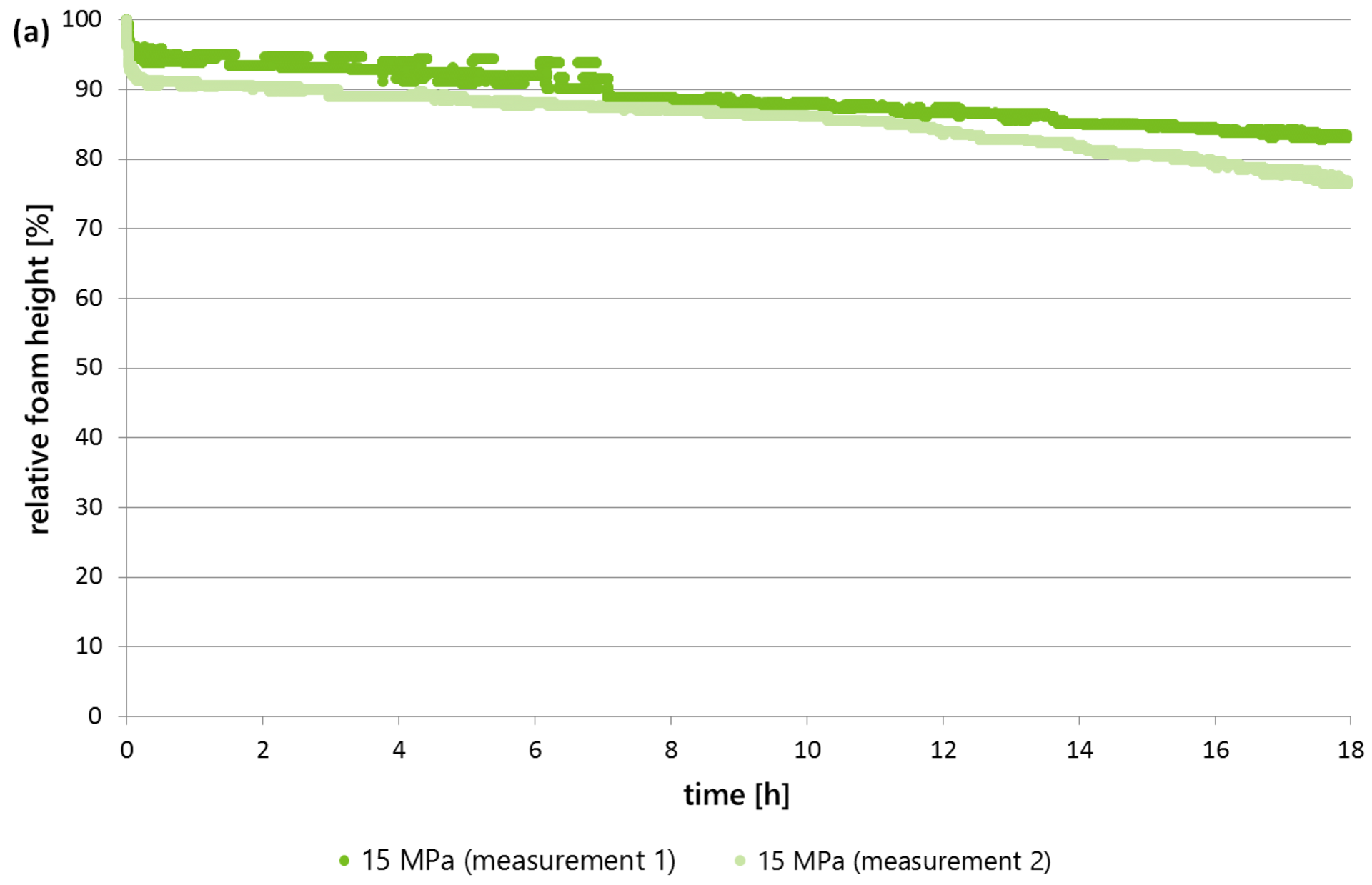 Since foams are very complex systems, reproducibility is a major challenge. The deviation between measurements under the same test conditions increases with increasing measurement duration. Fig. 6 shows two measurements under identical conditions at a pressure of 15 MPa. The results are easily reproducible. The deviation of the two measurements after 18 hours is 9% for the relative foam height and 1% for the medium bubble size.