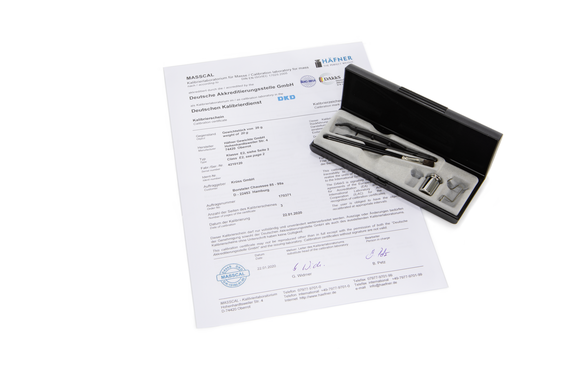 The CP0501 set includes an E2 reference weight with a mass of 20 g with which the force sensor of your tensiometer can be reliably adjusted. The actual value for the mass measured by the force sensor is adjusted to the nominal value of the accurate reference weight. The attached certificate from the German Calibration Service (DKD) indicates the high level of precision of the weight.