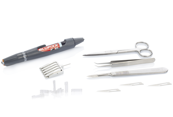 With the very fine tip of the supplied adhesive cartridge, the tiny drop of adhesive can be precisely dispensed. For easier handling, the cartridge sits in a holder equipped with a blue light source on the opposite side. The adhesive is cured after just 10 seconds.