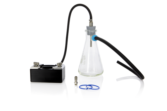 Regular and thorough cleaning of the filter plates used for foaming is essential to ensure a long service life and the same consistent gas permeability. Our TO4511 cleaning set helps here. The filter plates are placed in the holder of the set, which must be connected to the suction flask included in the scope of delivery. Once vacuum is applied, a flushing liquid can be sucked through the pores of the filter and into the flask. This ensures effective cleaning of the entire filter surface.